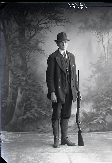 Porträtt, man stående i helfigur. Jägare med jaktkläder, hatt samt gevär. Ateljébild. Beställare: Anders Olsson.