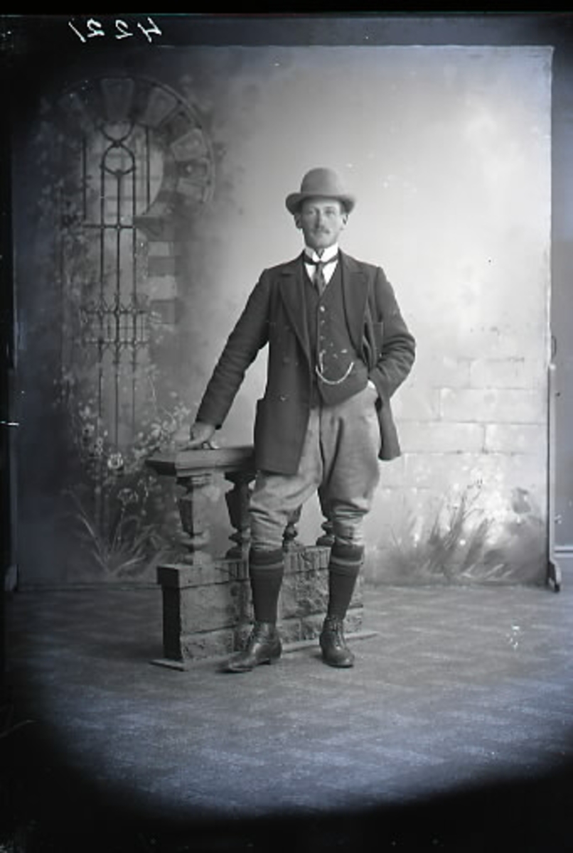 Porträtt, man stående i helfigur. Ateljébild. Iklädd rock, hatt samt knälånga byxor. Stöder sig med höger hand på ett räcke (rekvisita) och vänster hand i fickan.