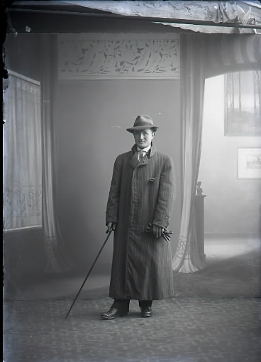 Mansporträtt, man stående i helfigur. Ateljébild. Iförd hatt och lång ytterrock, samt håller spatserkäpp i höger hand. Beställare: John Andersson, Sällstorp.