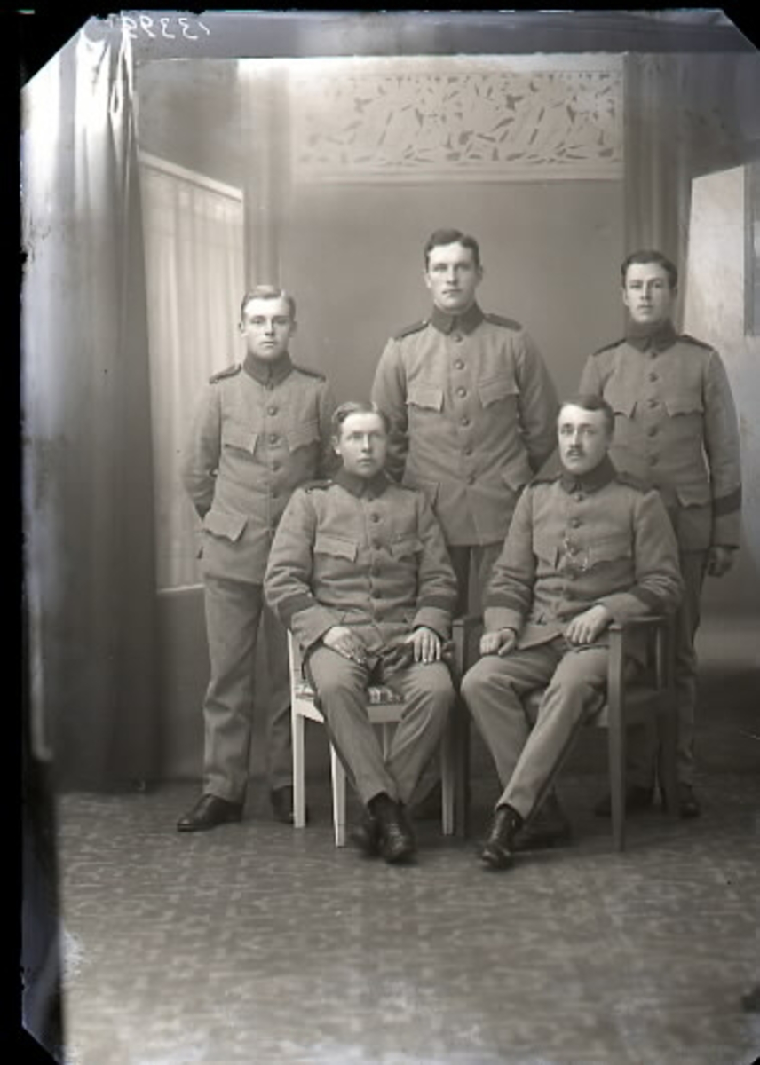 Gruppbild, fem (5) män i helfigur varav två sitter. Samtliga är iförda militäruniform. Ateljébild. Beställare: Thelandersson, 9 komp.