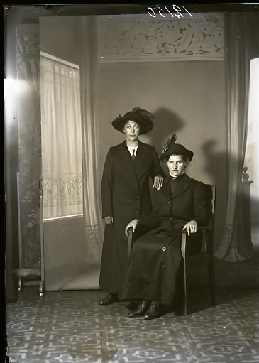 Gruppbild, två (2) kvinnor i helfigur varav en sitter. Båda iförda ytterkläder och hatt. Ateljébild. Beställare: Anna Johansson. Handelsföreningen.