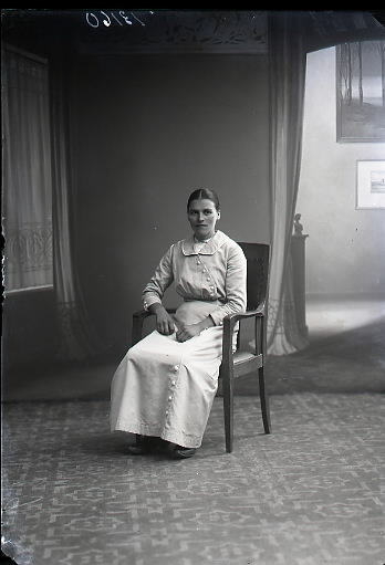 Kvinnoporträtt, kvinna sittande i helfigur. Ateljébild. Beställare: Kristina Karlsson.