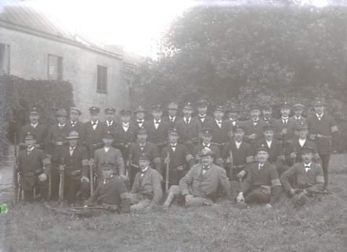 Gruppbild, många män från Landstormen iförda uniform(?) med armbindel , hattar och mössor fotograferade på en gräsmatta framför en stor byggnad. ( Kan vara Fästningen.) Männen har gevär med bajonett. Beställare: I. Lundin