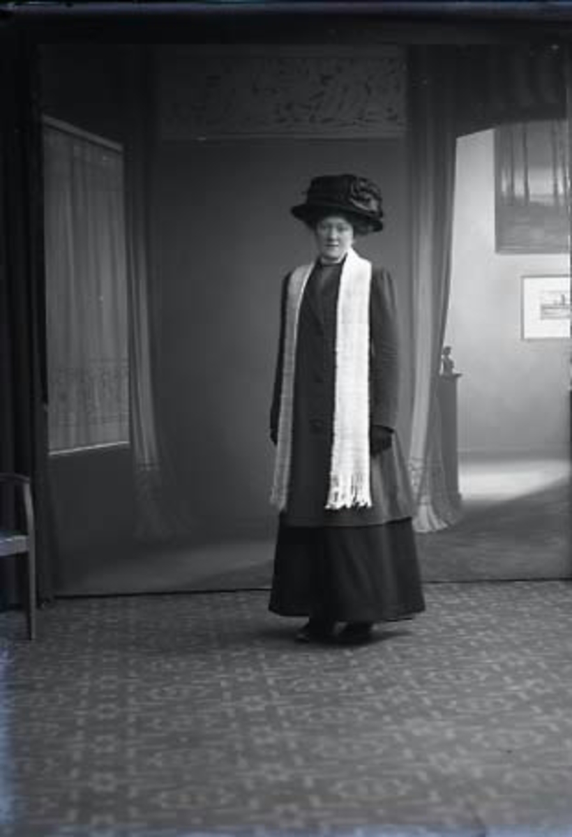 Kvinnoporträtt, kvinna stående i helfigur iförd ytterkläder, hatt och halsduk. Ateljébild. Beställare: Anna Svensson.