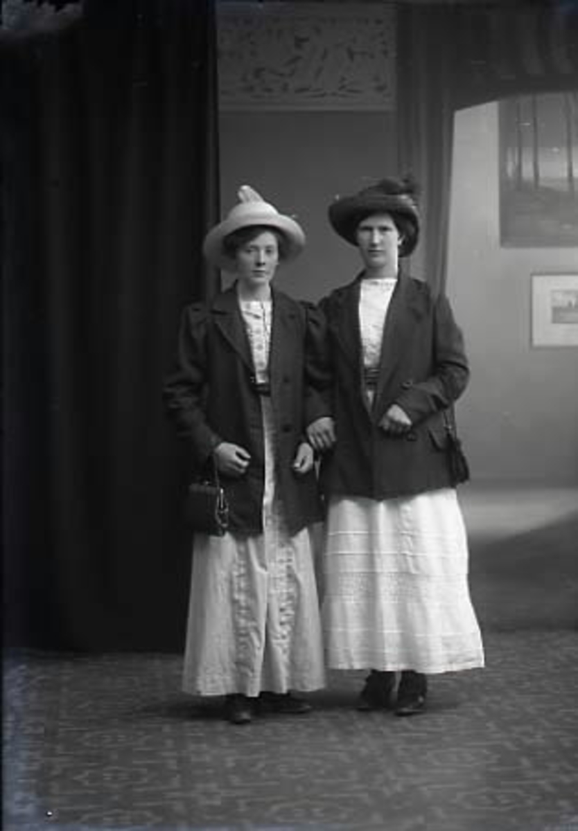 Gruppbild, två kvinnor stående i helfigur iförda ytterkläder och hatt. En av kvinnorna har en handväska. Ateljébild. Beställare: Karin Karlsson.