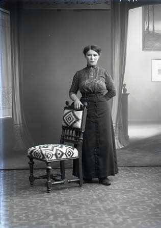 Kvinnoporträtt, kvinna stående i helfigur. Ateljébild. Beställare: Alma Johansson.