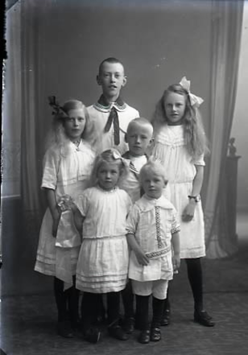 Syskongrupp, sex (6) barn i olika åldrar stående i helfigur. Ateljébild.
