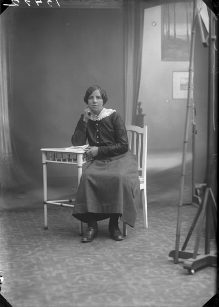 Porträtt ateljébild. Bilden föreställer sittande kvinna lutande höger armbåge mot ett bord där också en bok ligger. Beställare: Selma Johansson.