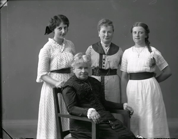 Ateljébild med fyra kvinnor i olika åldrar. Den äldsta sitter i en länsstol.
