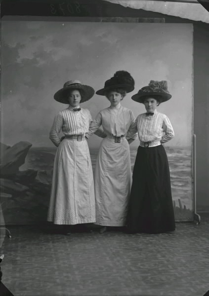 Ateljébild av tre unga kvinnor i modernt storbrättade hattar, s k kvarnhjulshattar. Beställare: Linnéa Andersson.