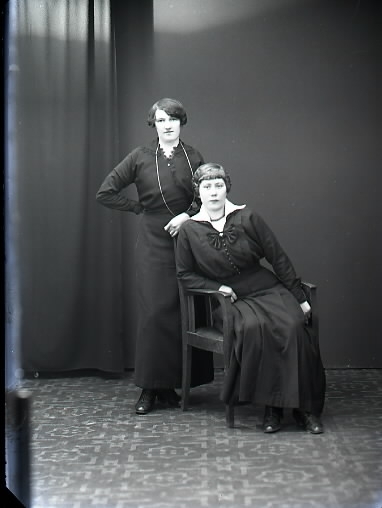 Gruppbild, två kvinnor i helfigur där en sitter. Ateljébild. Beställare: Anna Andersson. ( Byggmästare Nilsson. )