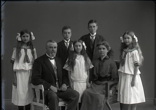 Ateljébild. Alfred Nilsson med familj, maka och fem barn där föräldrarna sitter. Två av döttrarna bär likadana sjömansklänningar och alla tre har utslaget hår med stora rosetter. Beställare: Alfred Nilsson. Fototid (osäker) 1910.