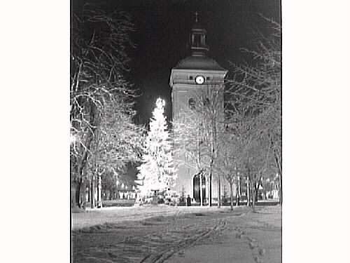 Varbergs kyrktorn sett från Brunnsparken med julgran i snöskrud.