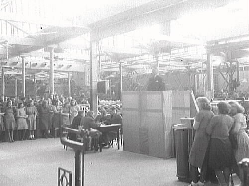 Interiörbild från okänd textilindustri. En man står och talar från ett upphöjt podium till personalen. (Möjligen MYAA/MAB kv Renen 13, Varberg)
