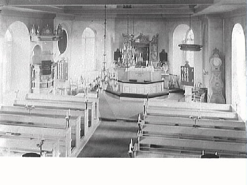 Interiörbild av Stamnareds kyrka från läktaren mot koret. Altare, altaruppsats, altarring, predikstol, golvur, bänkar.