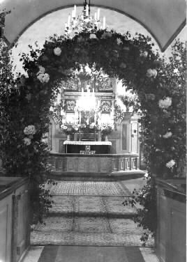 Interiör av Rolfstorps kyrka i samband med musikdirektör Nils Sjöbloms bröllop, andra giftet med Ester, född Levén. En ärebåge står längst fram över korgången vid kyrkbänkarna. (Se även GB2_3392-3395.)