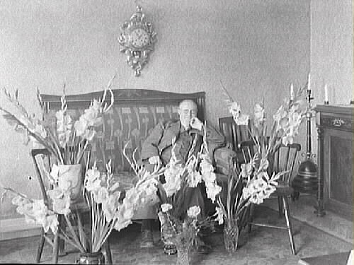 Herr Johansson, Varbergs Importaffär, firar troligen sin 50-årsdag. Han sitter i en jugendsoffa med ett väggur ovanför och en mängd blommor (gladiolus) i vaser på golvet omkring sig. Bilden är tagen i bostaden.