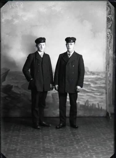Ateljéfoto av två ynglingar i skärmmössor mot havsfond. Beställare: Gunnar Ljunggren.