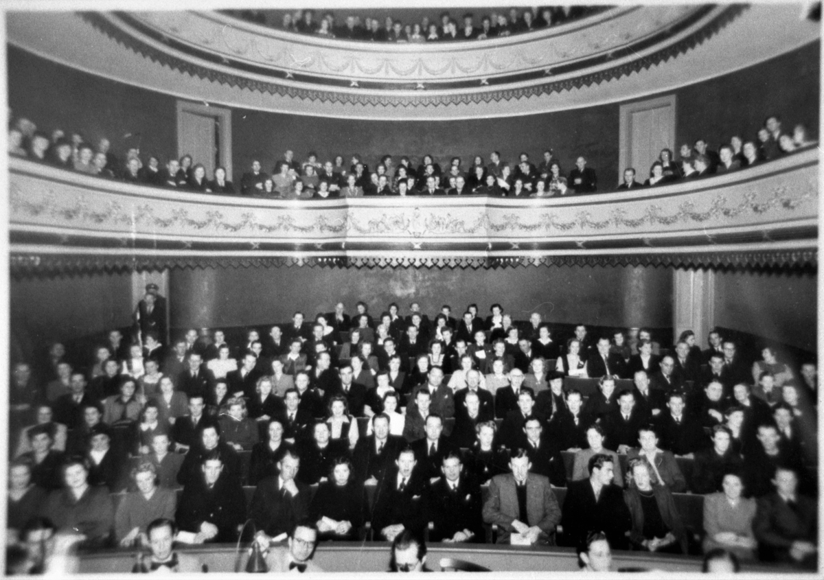 Varbergs teaters salong med publik, taget från scenen. I nederkanten syns några ansikten på musikerna i orkesterdiket.