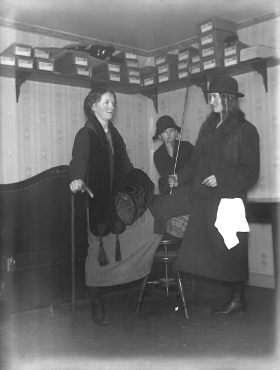 Tre personer som spelar amatörteater vid en orgelpall, sänggavel och hylla med skokartonger. (Se även bildnr HB647)
