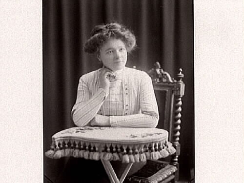 Kvinnoporträtt. Ung kvinna sitter med handen under hakan vid ett bord. (Se även bildnr MR2_1143)