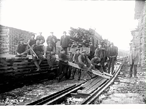 Snickeri & träarbete. Gruppbild av arbetare vid en brädgård, Varbergs snickerifabrik. En räls för godstransporter löper genom området.