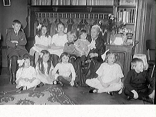 En äldre kvinna sitter omgiven av tio barn i en beramad soffa. Bild 2) Närbild på den äldre kvinnan och barnet i hennes knä.