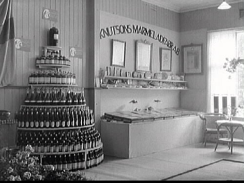 Knutsons marmeladfabriks monter på Hantverksmässan i Gamlebyskolan i Varberg 1927. I förgrunden exponeras även olika drycker.