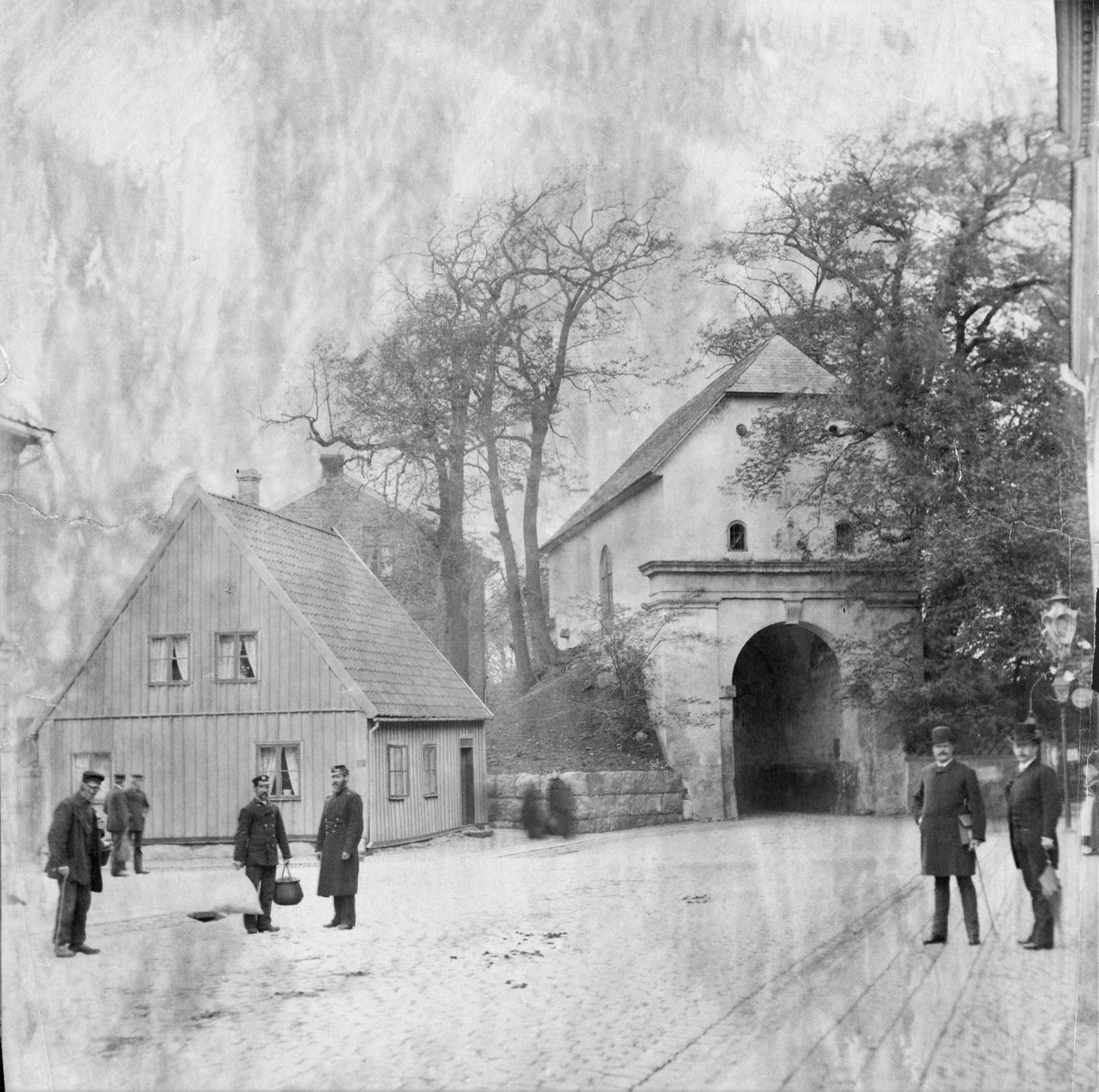 Gatubild vid Norre Port i Halmstad, sedd från Storgatan. Flera män i olika munderingar står längs vägen, vända mot fotografen. Den norra stadsporten ingick i det befästa Halmstad och stod klar 1601, alltså under danskt styre. Dess sneda vinkel gentemot Storgatan lär ha funktionen att förhindra beskjutning in mot staden. Varje natt stängdes alla stadsportarna till skydd åt invånarna.