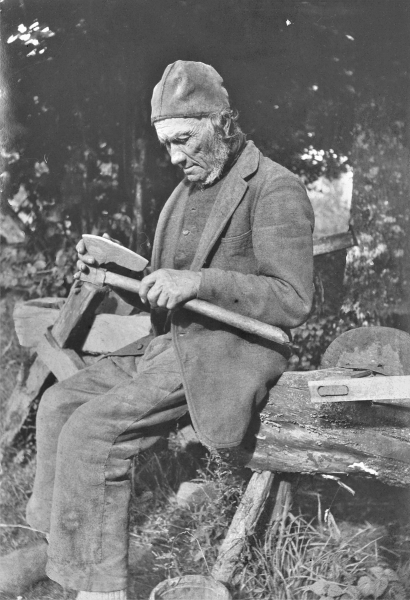 En äldre man i mössa sitter utomhus vid slipstenen och känner efter om yxans egg blev vass nog av slipningen.