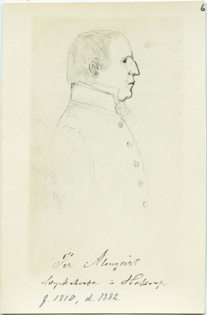 Tecknat porträtt på Per August Almqvist Fil. doktor, prost i Hakarp. Född 11 juni i Gränna och död 9 oktober 1882 i Hakarps prästgård, huskvarna