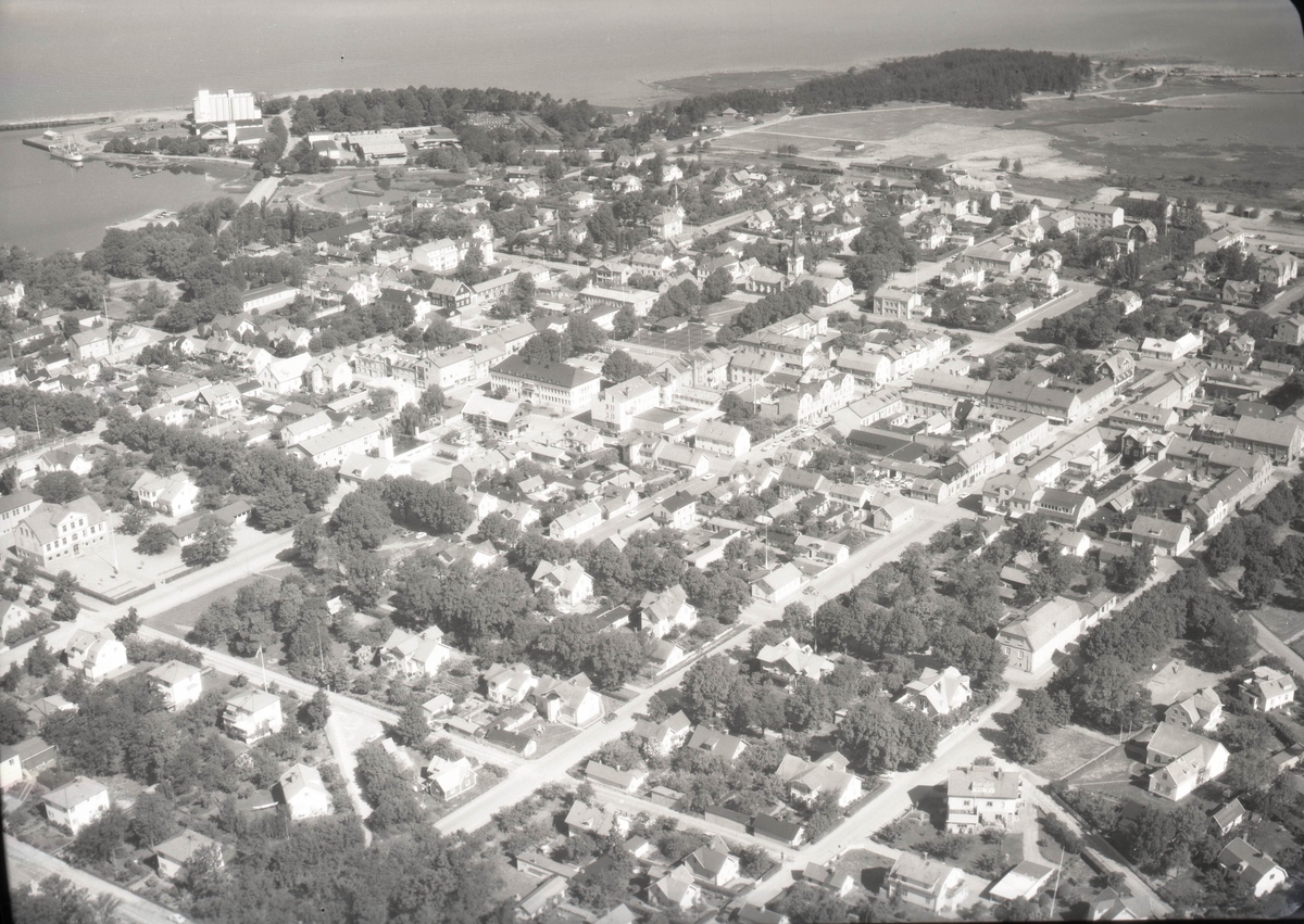 Flygfoto över Borgholm, staden med byggnader kvarter och hamnen.