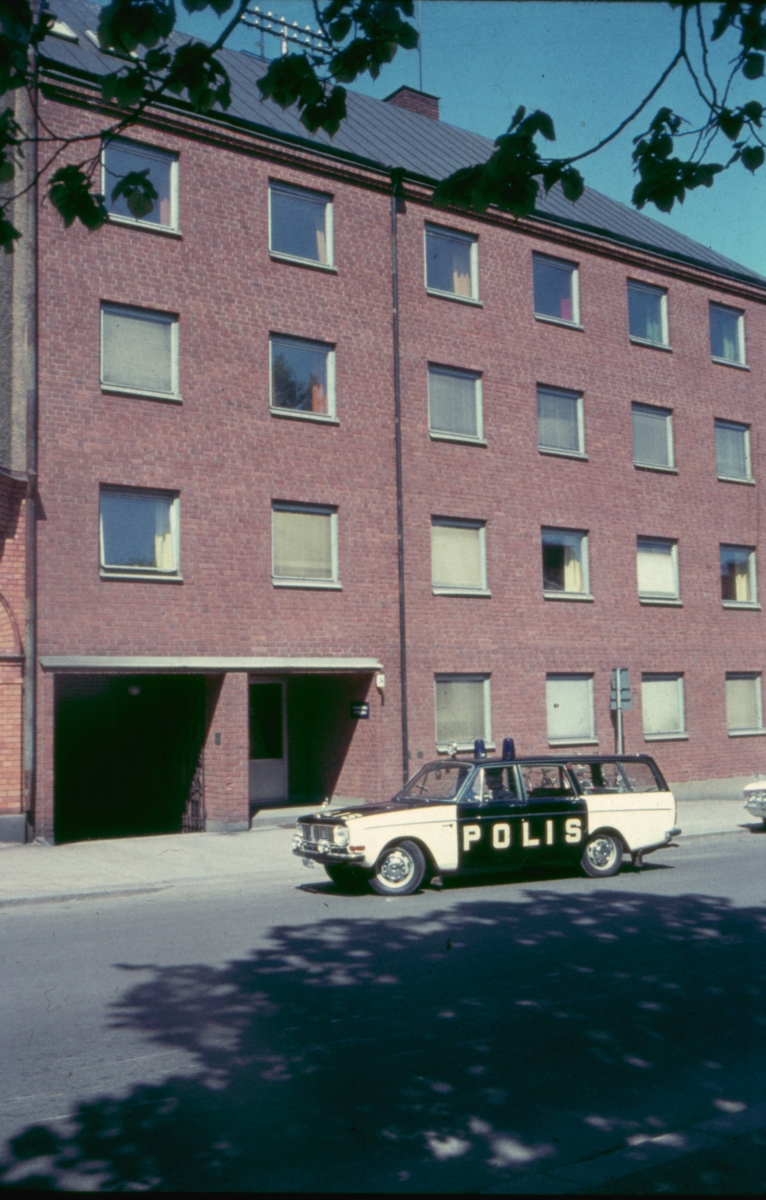 En polis i Västervik i början av 1970-talet. Huset i bakgrunden är polisstationen.