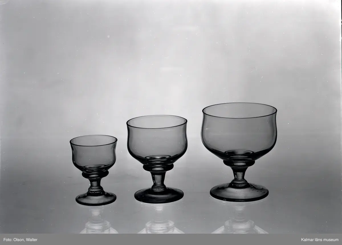 Ett likörglas, portvinsglas och madeiraglas ifrån Skrufs Glasbruk AB.