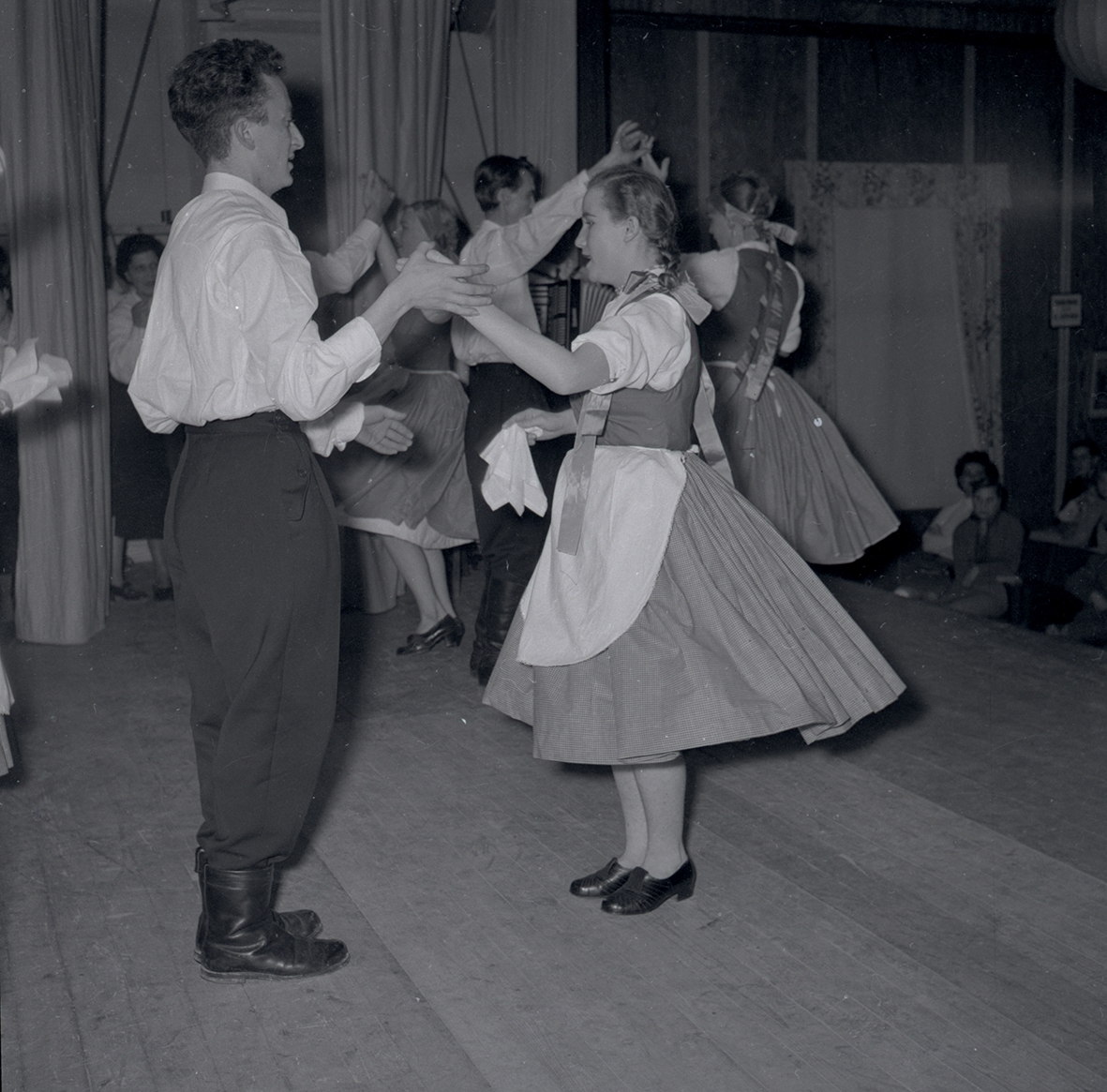 Bild tagen i samband med att flyktingar ifrån Ungern kom 1956. Män och kvinnor som dansar. Kvinnorna dansar i traditionella romska folkträkter i Godtemplargården hösten 56 - våren 57.