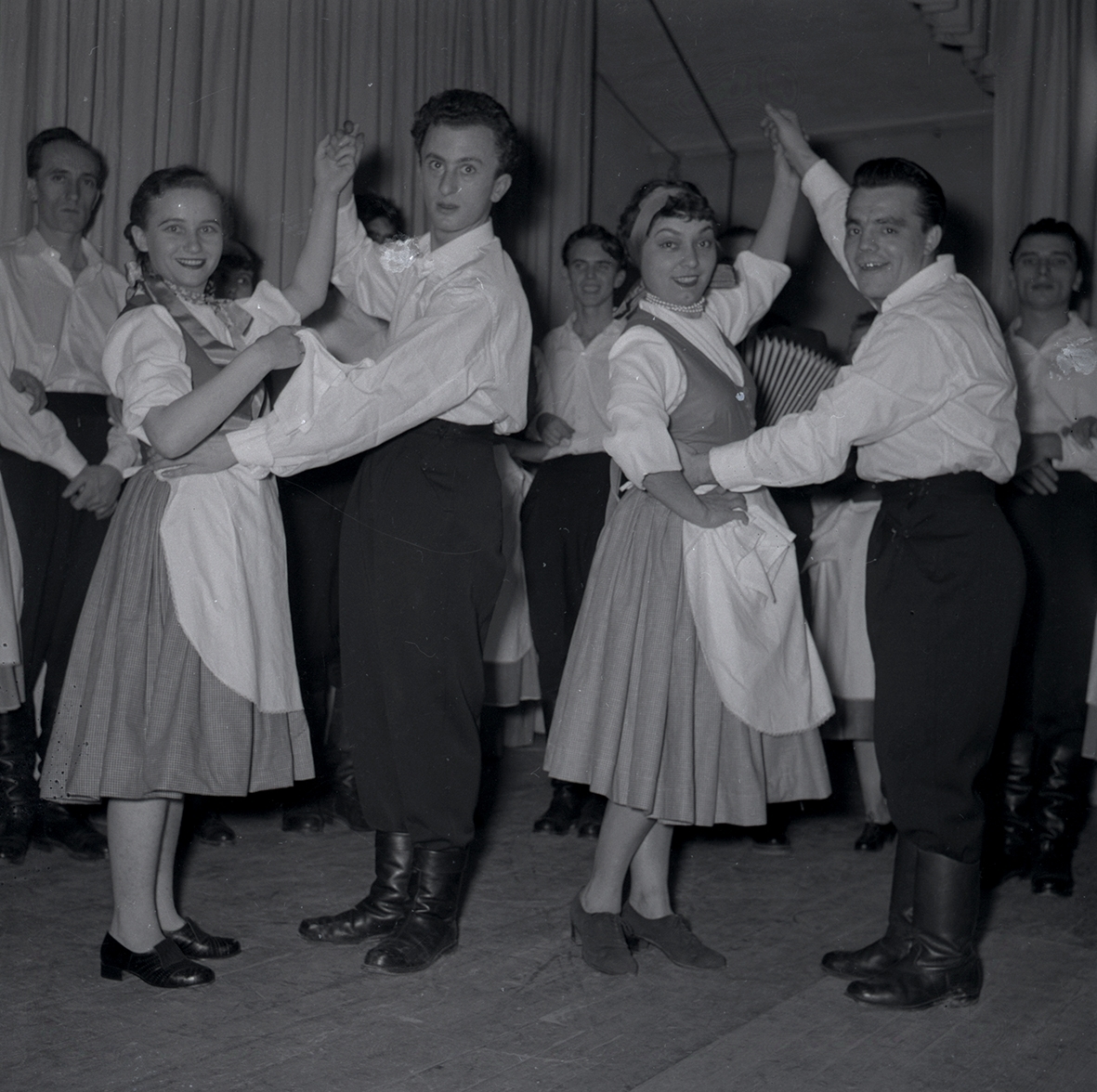 Bild tagen i samband med att flyktingar ifrån Ungern kom 1956. Män och kvinnor som dansar. Kvinnorna dansar i traditionella romska folkträkter i Godtemplargården hösten 56 - våren 57.