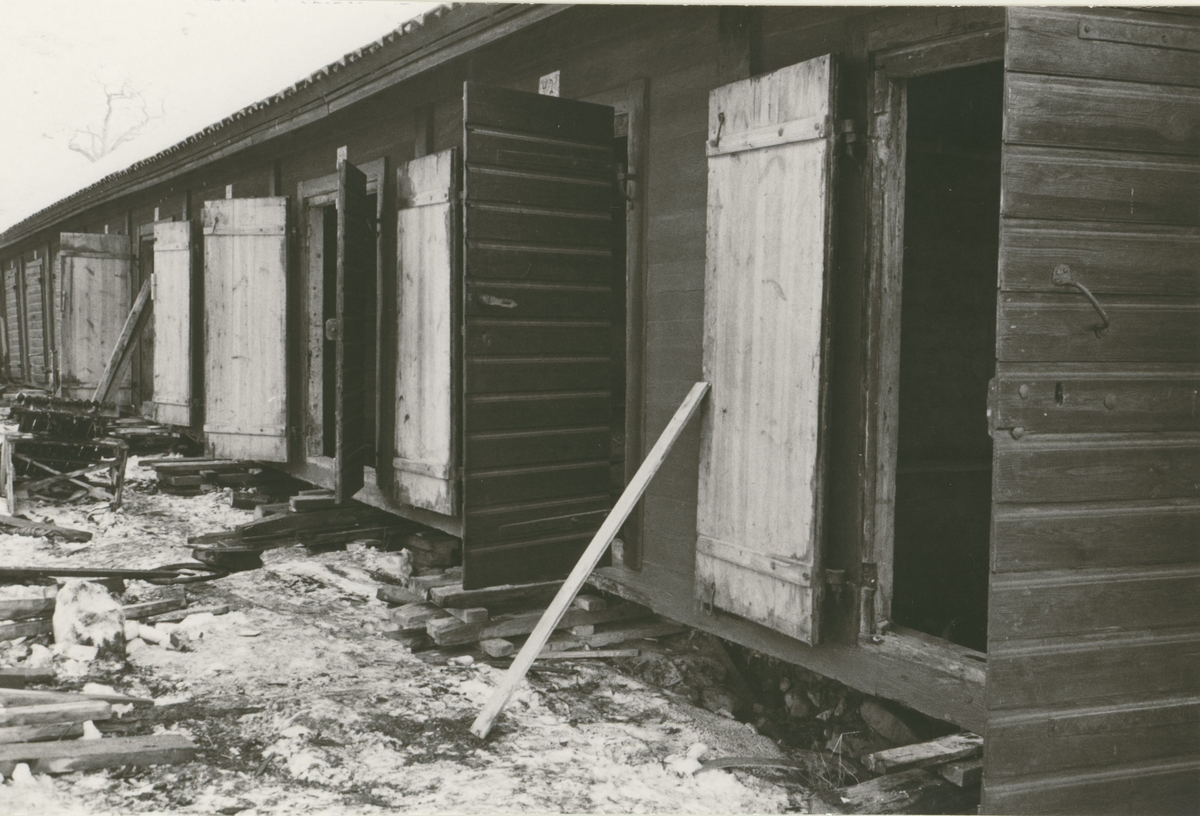 Renovering som pågår i kyrkstallarna från Madesjö som numera är ett hembygdsmuseum. Norra längan från söder.