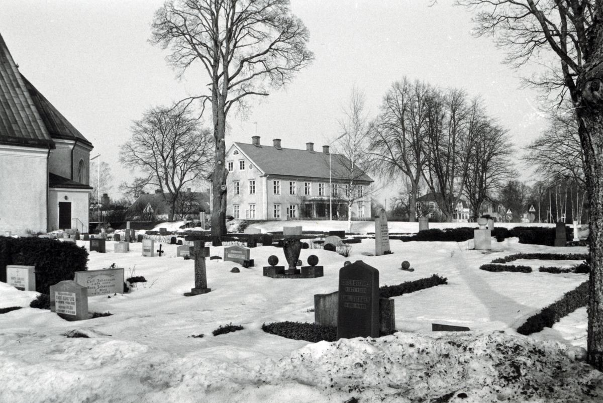 Absiden på Madesjö kyrka och prästgården i fonden.