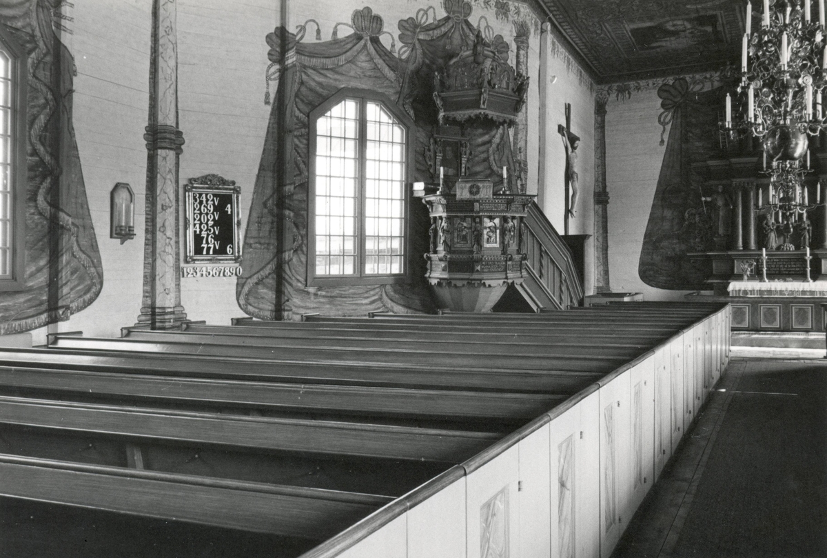 Titel: Interiören av Frödinge kyrka med kyrkbänkar, ljushållare, nummertavla, fönster, predikstol, krucifix, altare och ljuskronor.