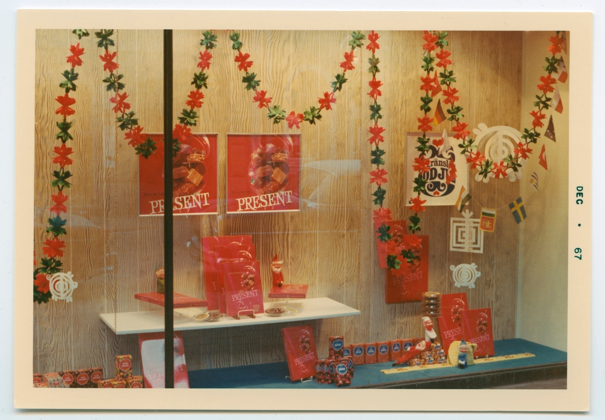 Julskyltning med chokladaskar, i ett fönster på Domus i Kalmar, 1967.