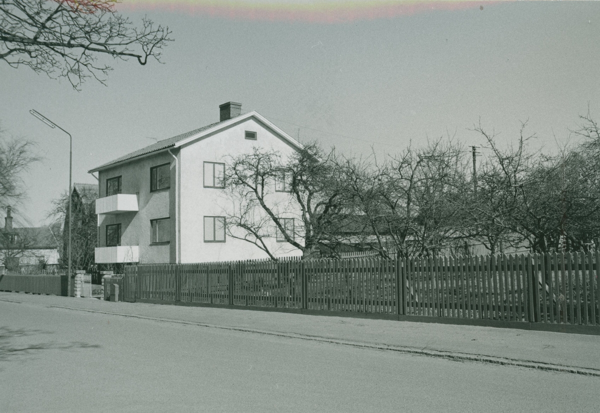 Bostadshus med putsad fasad och ett staket på Rappegatan 8 i Ängö.