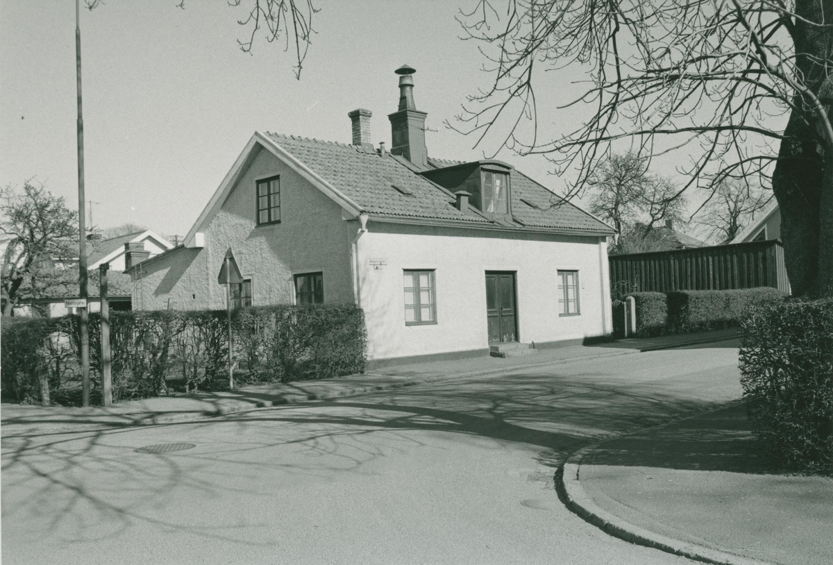 Ett bostadshus med putsad fasad och en häck på Baggensgatan 1 i Ängö.