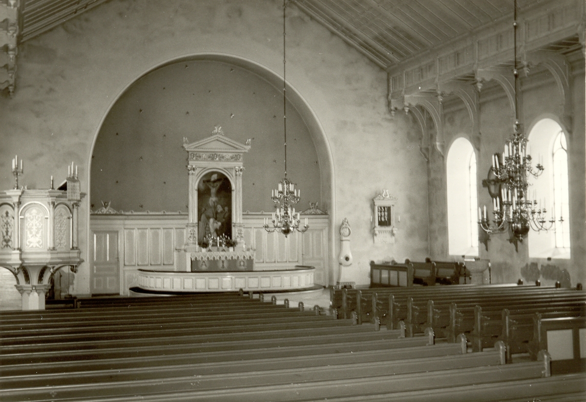 Interiör från långhuset i Hannäs kyrka innan restaurering.