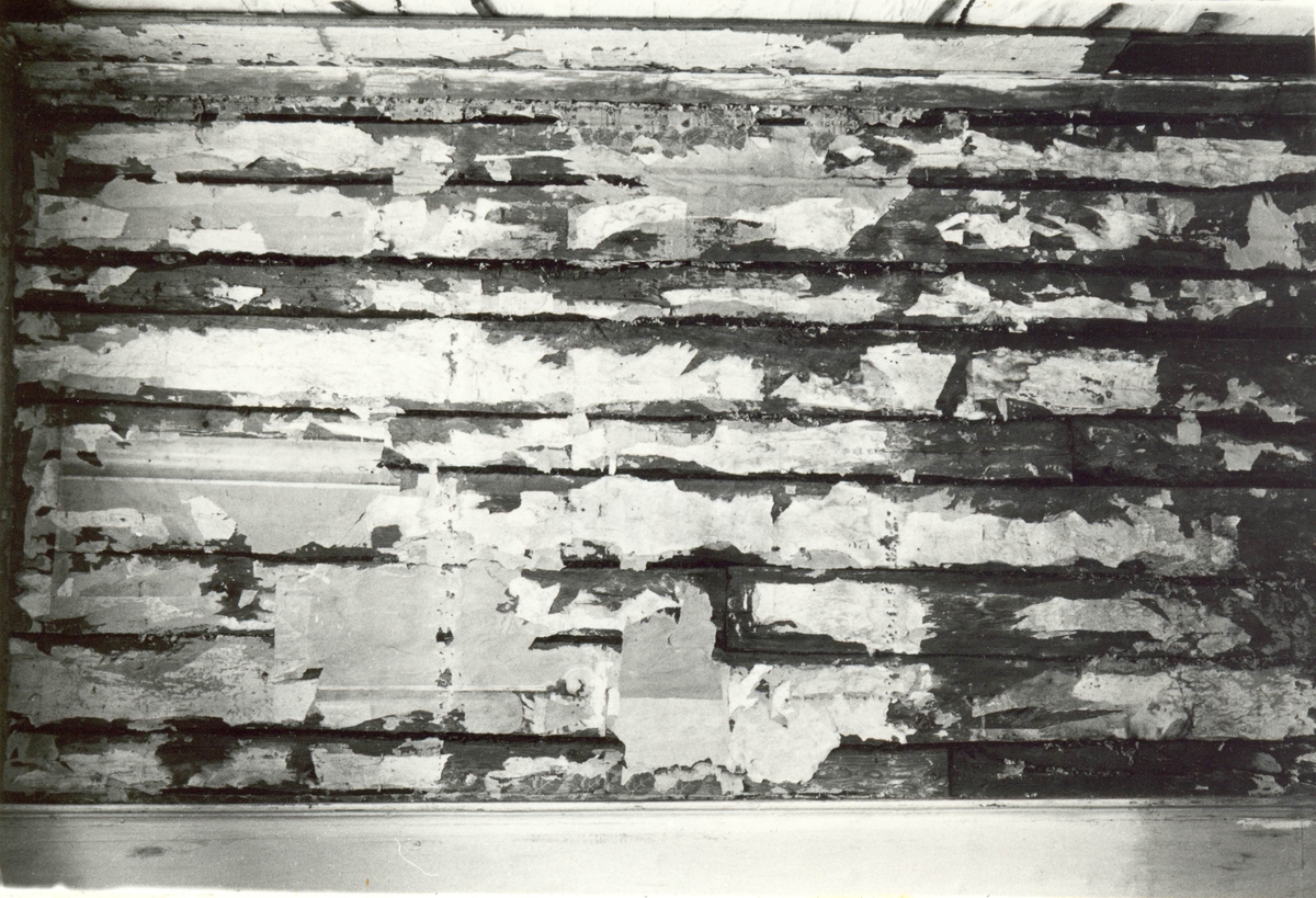 Hela östra väggen, ovanför bröstpanelen, sedd från salsdörren, rester av målad tapet i Krusenstiernska gården.