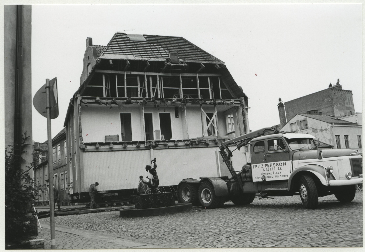 Areskogska husets flyttning 30.9. - 3.10. 1970. Här ser man hur huset är kapat.