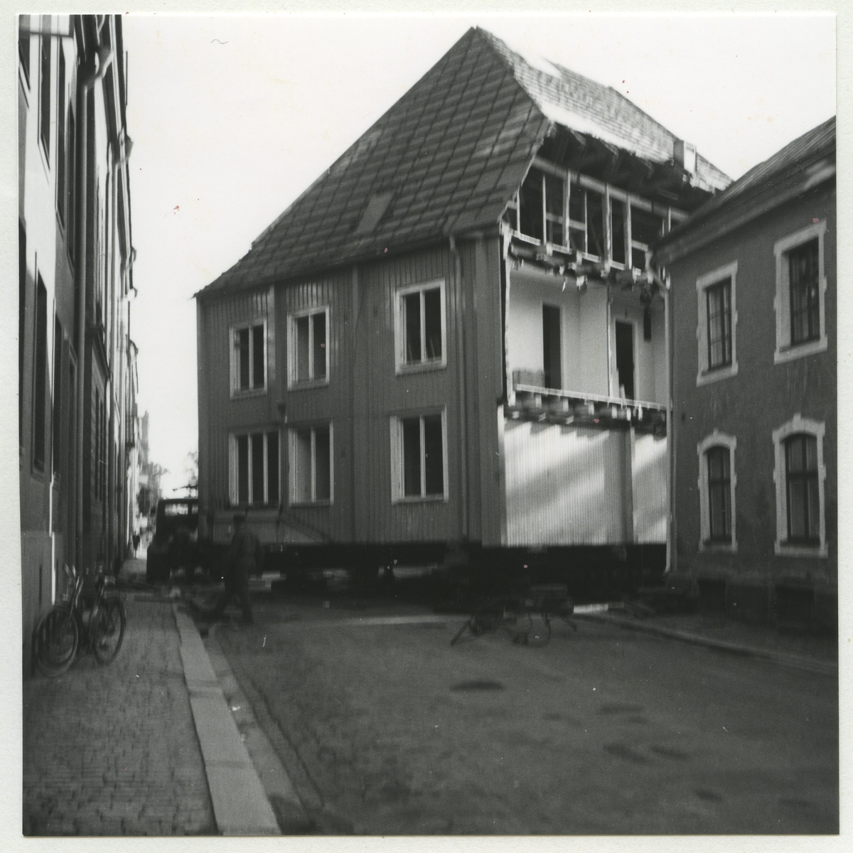 Areskogska husets flyttning 30.9. - 3.10. 1970. Huset svängs in i kvarteret Domprosten.