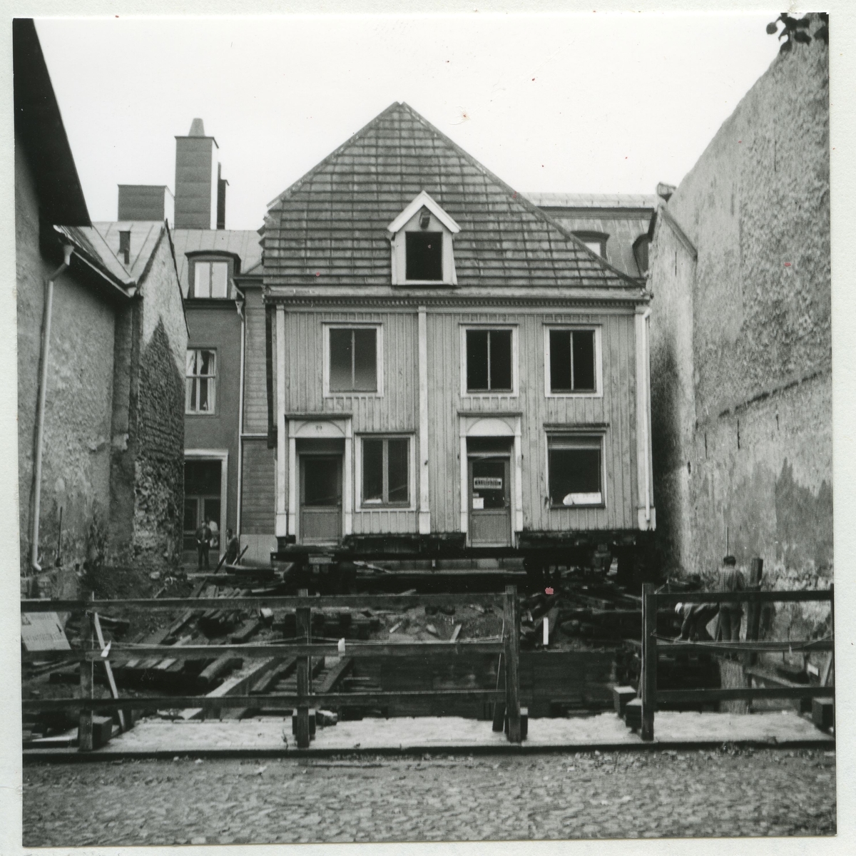 Titel: Areskogska husets flyttning 30.9. - 3.10. 1970. På väg in på den nya tomten, från Södra Vallgatan.