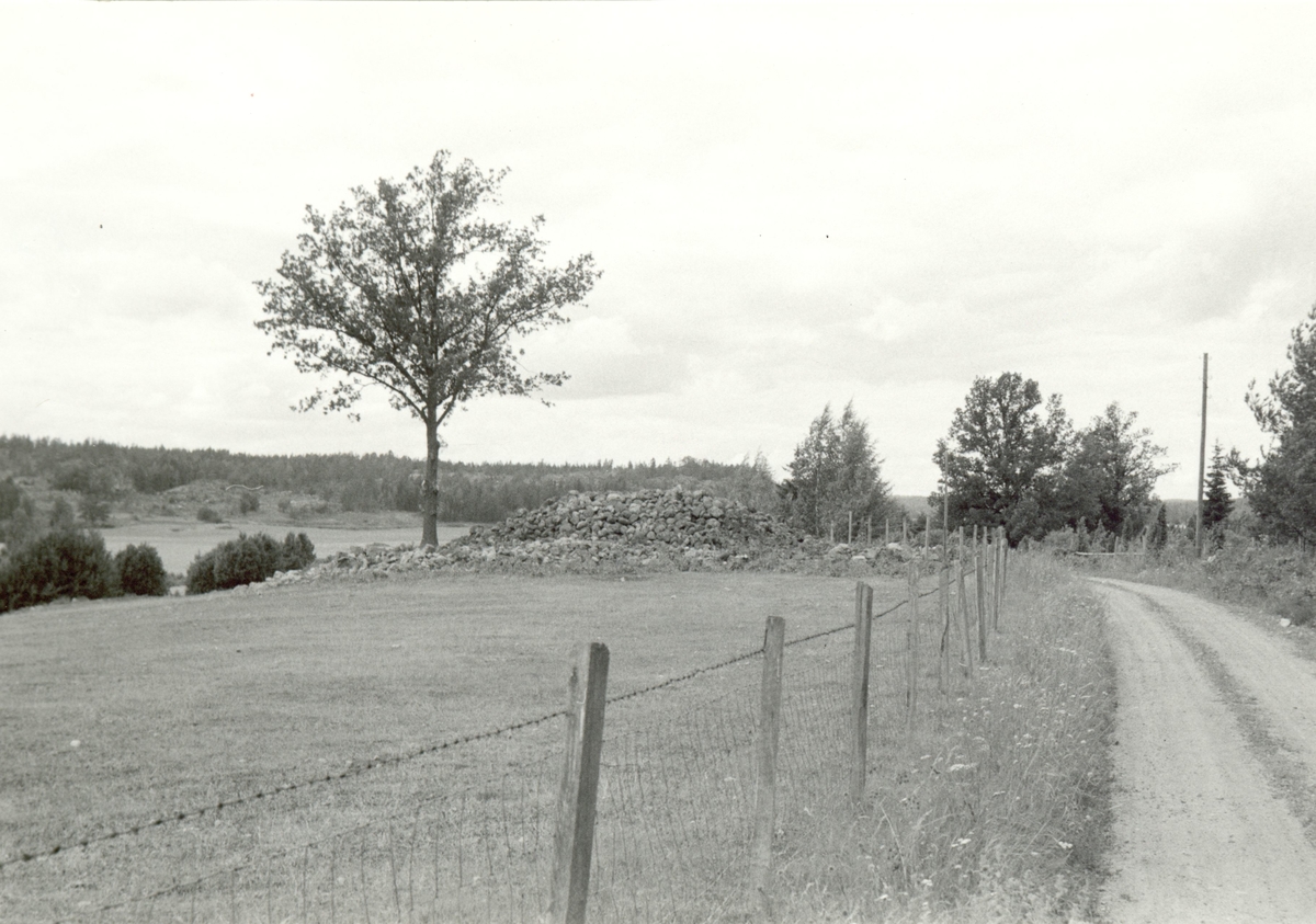 Motiv från en fornlämning i Dvärgstad. Röse vid odlingslandskap.