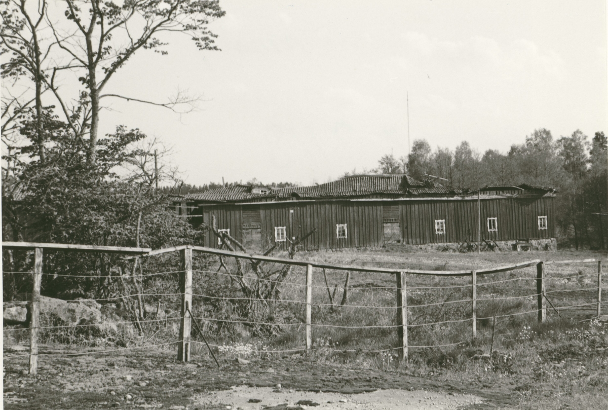 Motiv från Pukebergs glasbruk. En förfallen ekonomibyggnad och ett staket i förgrunden.