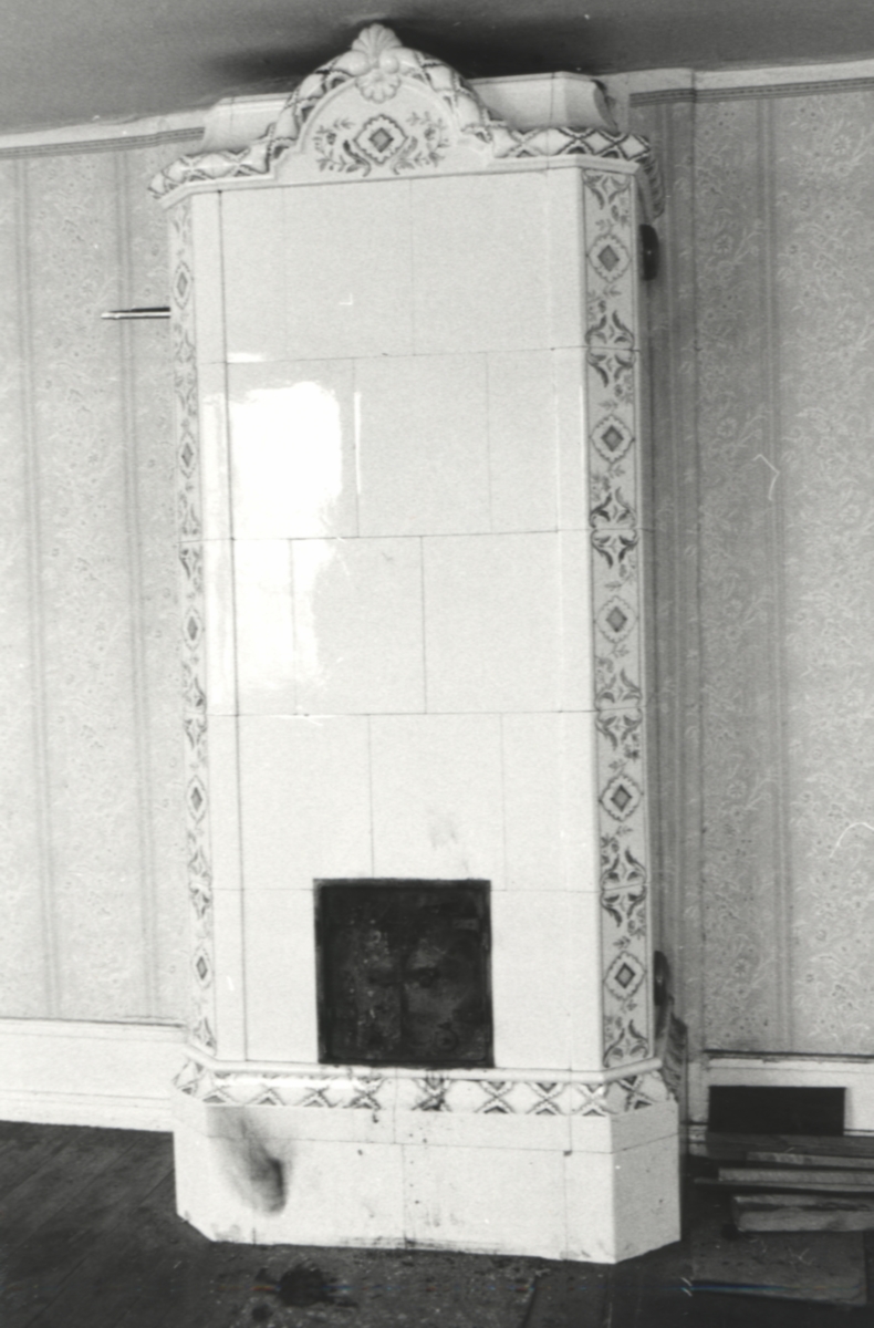 Kakelugn i övervåningens största rum. Bland annat utförd i rosa färg. Huset rivet 1971.